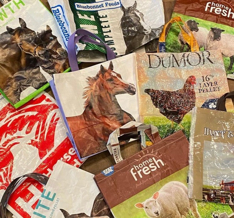 Using recycled and new grain bags provided by local farms and feed companies, our volunteers turn them into shopping bags and wine totes. These feed companies include BAR ALE, L. A. Hearne, Purina and Hunt & Behrens.